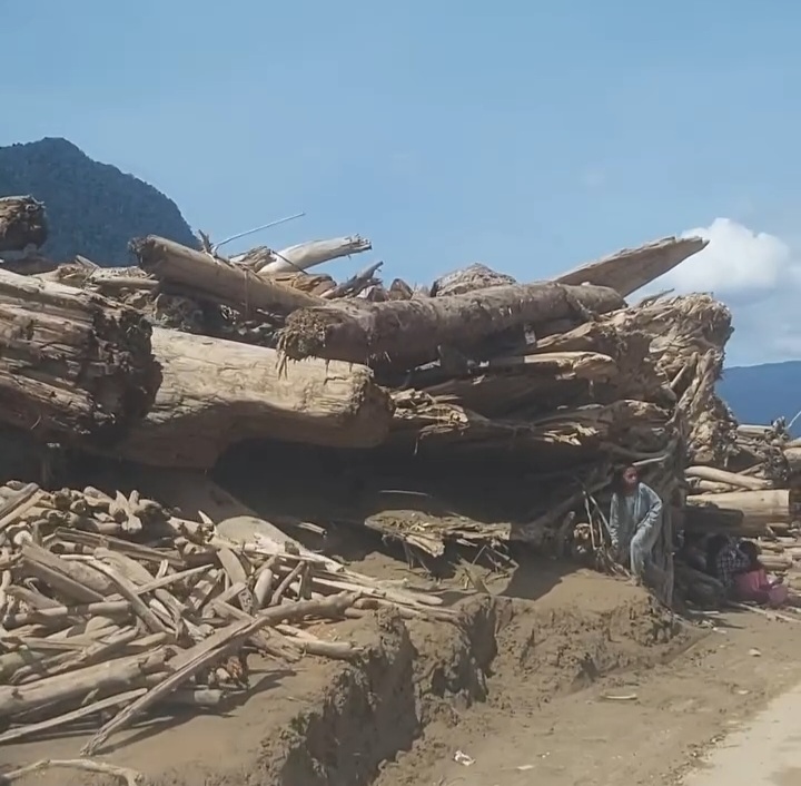 Tinggi tumpukan kayunya bisa mencapai sekitar tiga meter dari permukaan tanah, bahkan di sejumlah titik diperkirakan menumpuk hingga empat meter. Material kayu tersebut hanyut dari wilayah hulu sungai menerjang pemukiman menyusul hujan berintensitas tinggi.