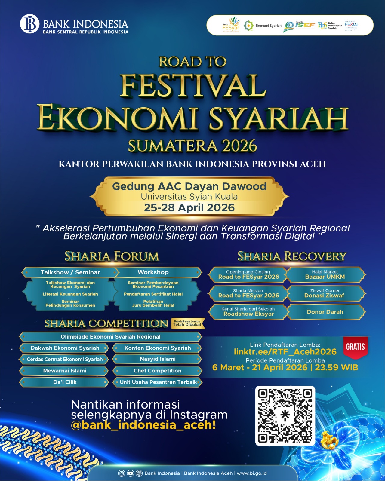 Banda Aceh (Waspada Aceh) – Kantor Perwakilan Bank Indonesia (BI) Provinsi Aceh akan menggelar Road to FESyar 2026 pada 25–28 April 2026 di Gedung AAC Prof. Dayah Dawood, Universitas Syiah Kuala. Kegiatan ini ditujukan untuk mendorong pemulihan sekaligus memperkuat ekonomi dan keuangan syariah di Aceh.