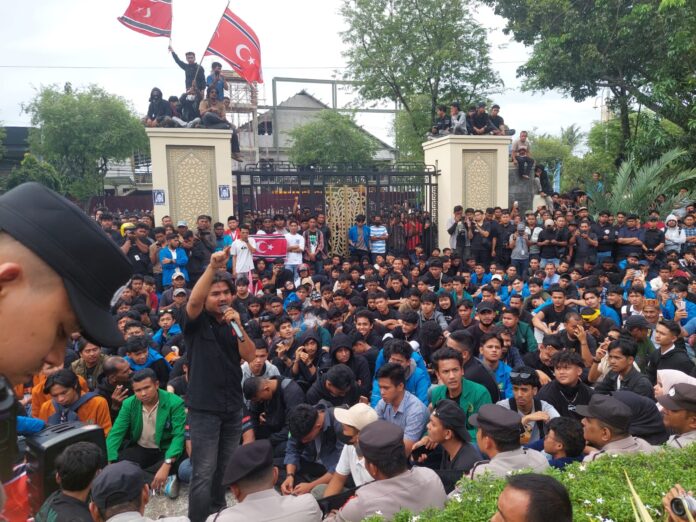 Banda Aceh (Waspada Aceh) – Ribuan massa dari berbagai elemen masyarakat dan mahasiswa yang tergabung dalam Aliansi Rakyat Aceh menggelar aksi unjuk rasa di depan gedung Dewan Perwakilan Rakyat Aceh (DPRA), Senin (1/9/2025).