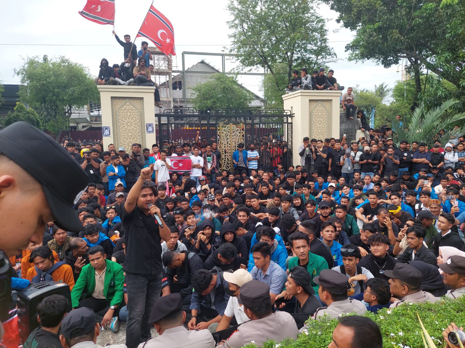 Aksi dimulai sekitar pukul 14.30 WIB, diwarnai dengan pengibaran bendera bergambar karakter One Piece dan bendera merah dengan simbol bulan bintang. Di tengah hujan gerimis, massa melantunkan shalawat dan berorasi menyampaikan aspirasi.