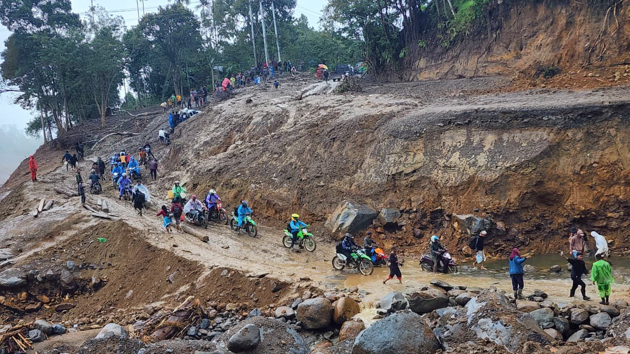 Medan longsor yang sangat sulit dan berat membuat kendaraan roda empat tidak mampu melintas. Tim kemudian beralih menggunakan motor trail dan hanya bisa mencapai Jembatan Tengge Besi.