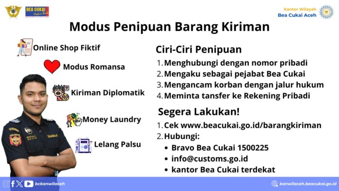 Banda Aceh (Waspada Aceh) – Kanwil Bea Cukai Aceh mengingatkan masyarakat untuk lebih waspada terhadap berbagai modus penipuan yang mengatasnamakan Bea Cukai, terutama terkait barang kiriman dari luar negeri.