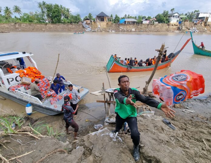 Tim dari Polairud Polres Bireuen berjibaku sejak hari ke-4 pasca bencana yang melanda pada 26 November lalu. Mereka membantu warga menyeberang sekaligus mengawal distribusi logistik.