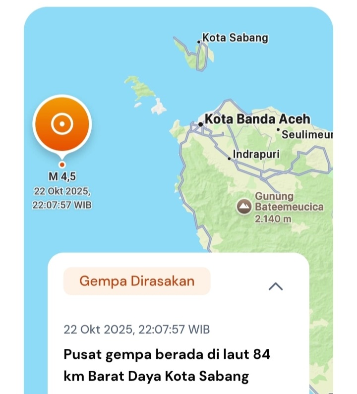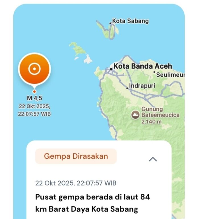 Banda Aceh(Waspada Aceh) – Ibukota Provinsi Aceh, Kota Banda Aceh merasakan gempa berkekuatan 4,5 Magnitudo, malam ini, sekitar pukul 22.07 WIB, Rabu (22/10/2025).