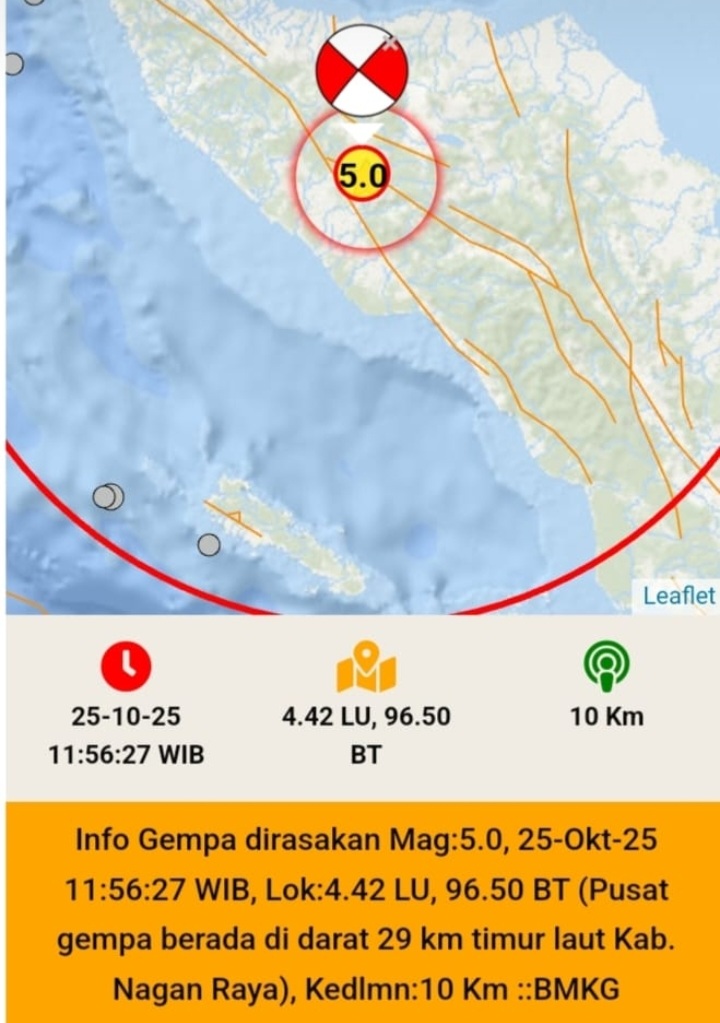 Suka Makmue (Waspada Aceh) – Gempa berkekuatan 5,0 Skala Richter (SR) mengguncang Kabupaten Nagan Raya. Gempa tersebut terjadi pada pukul 11.56:27 WIB, Sabtu (25/10/2025), saat masyarakat sedang melaksanakan aktivitas masing-masing.
