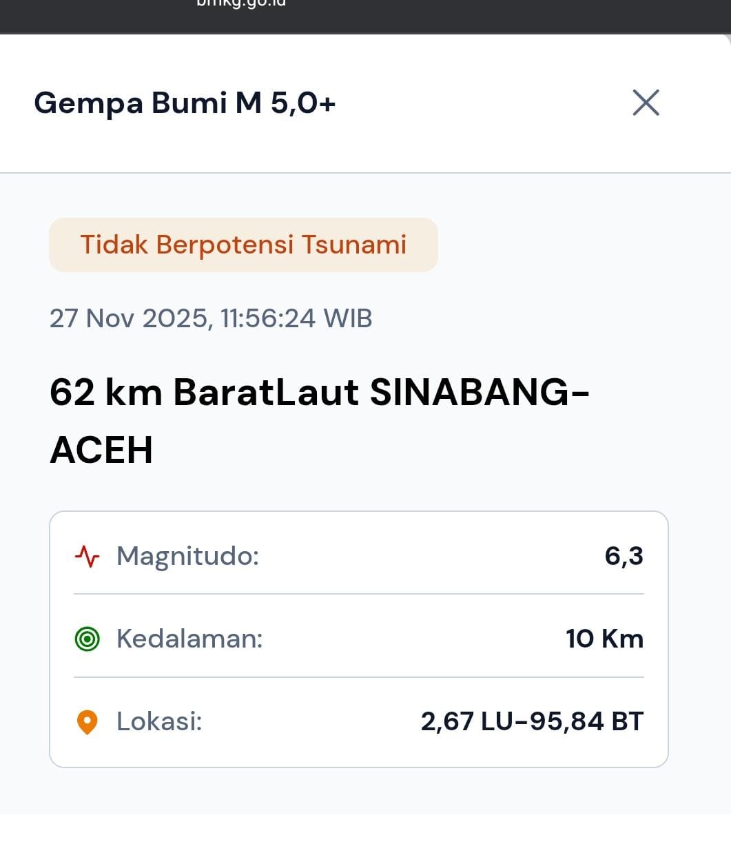 Banda Aceh (Waspada Aceh)– Gempa bumi berkekuatan magnitudo 6,3 mengguncang wilayah Aceh pada Rabu (27/11/2025) pukul 11.56 WIB.