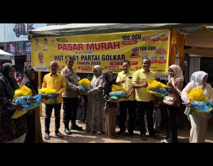 Aceh Besar (Waspada Aceh) – Ratusan warga menyerbu pasar murah yang digelar Dewan Pimpinan Daerah (DPD) II Partai Golkar Aceh Besar di halaman kantor partai, Minggu (5/10/2025).