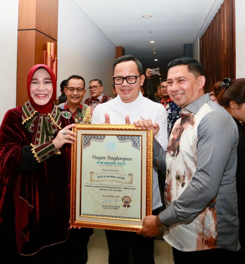 Wali Kota Banda Aceh, Hj. Illiza Sa’aduddin Djamal, S.E., menerima Penghargaan ADINKES Award 2025 dari Asosiasi Dinas Kesehatan Seluruh Indonesia (ADINKES) untuk kategori Penanggulangan AIDS, Tuberkulosis, dan Malaria (ATM).