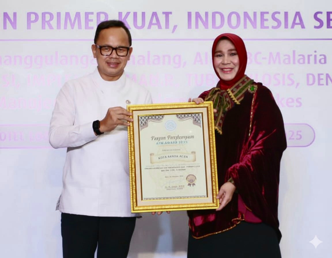 Wali Kota Banda Aceh, Hj. Illiza Sa’aduddin Djamal, S.E., menerima Penghargaan ADINKES Award 2025 dari Asosiasi Dinas Kesehatan Seluruh Indonesia (ADINKES) untuk kategori Penanggulangan AIDS, Tuberkulosis, dan Malaria (ATM).