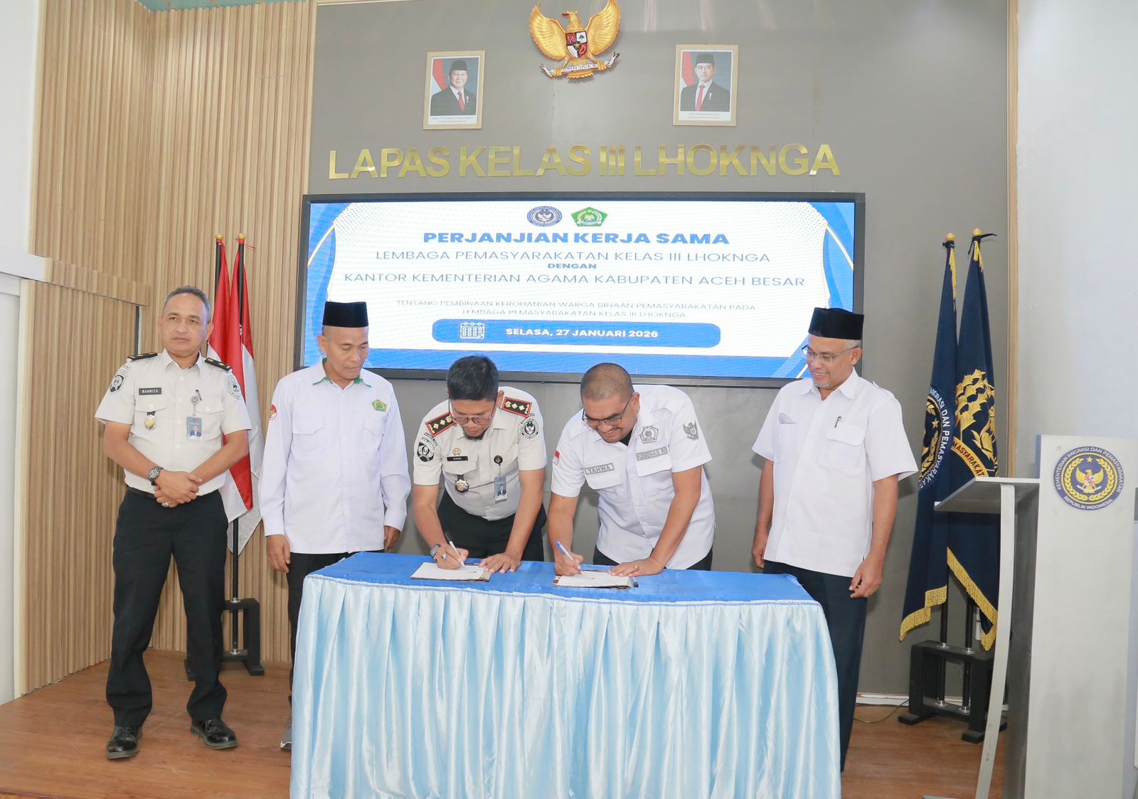Penandatanganan kerja sama dilakukan Kepala Kantor Kemenag Aceh Besar Saifuddin bersama Kepala Lapas Kelas III Lhoknga Husni di Lapas Lhoknga, Aceh Besar, Selasa (27/1/2026).