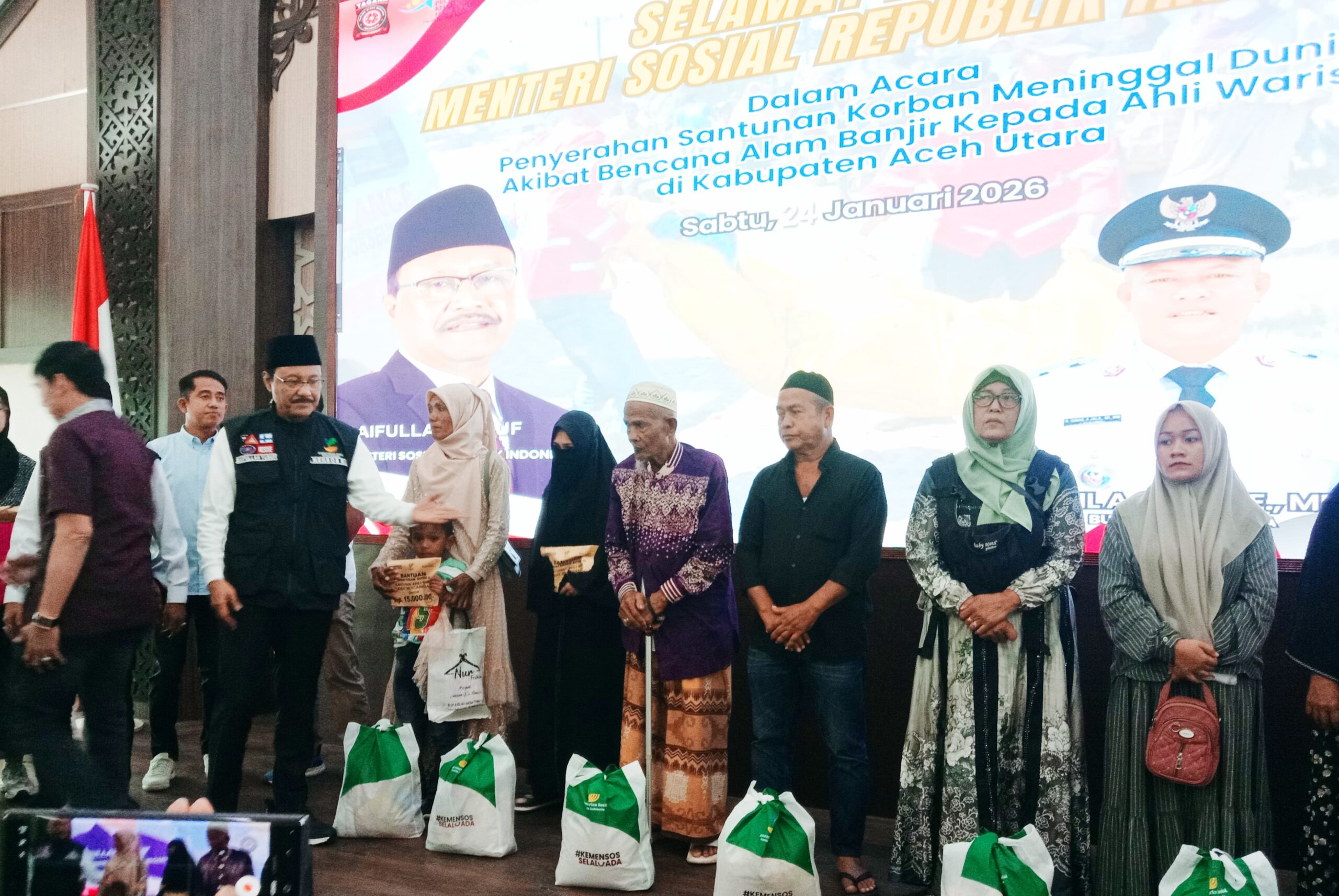 Penyerahan santunan duka secara simbolis dilakukan langsung oleh Menteri Sosial, Saifullah Yusuf, didampingi Wakil Bupati Tarmizi Panyang, anggota DPD RI asal Aceh Azhari Cage, Staf Khusus Gubernur Aceh, Teuku Irsyadi dan unsur Forkopimda Aceh Utara, berlangsung di Aula Kantor Bupati Aceh Utara, Sabtu (24/1/2026).