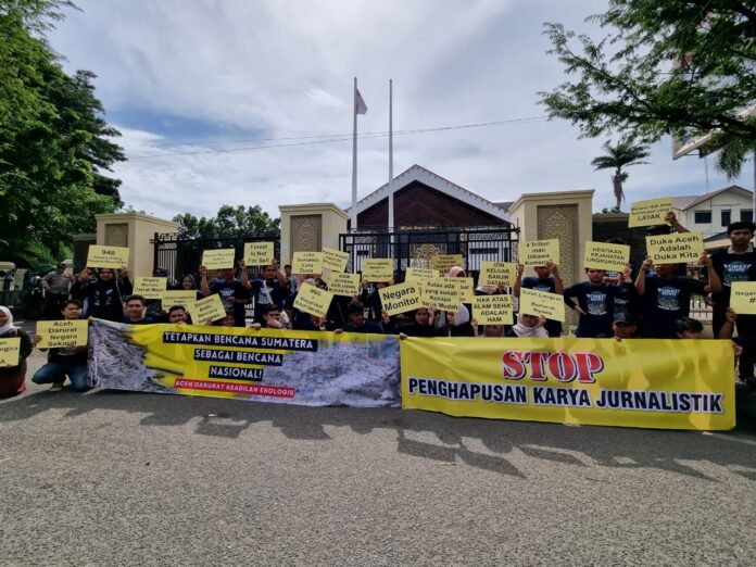 Banda Aceh (Waspada Aceh) – Koalisi masyarakat sipil menggelar aksi damai di depan Kantor Dewan Perwakilan Rakyat Aceh (DPRA), Selasa (16/12/2025), mendesak pemerintah pusat menetapkan banjir dan tanah longsor yang melanda Aceh, Sumatera Utara, dan Sumatera Barat sebagai bencana nasional.