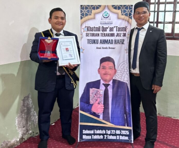 Bertempat di Ponpes Sulaimaniyah Afdhalul Akbar, Aceh Tamiang, Sabtu (20/9/2025), Hafiz bersama 15 temannya tampil dalam acara “Khatmil Qur’an Tasmi’.
