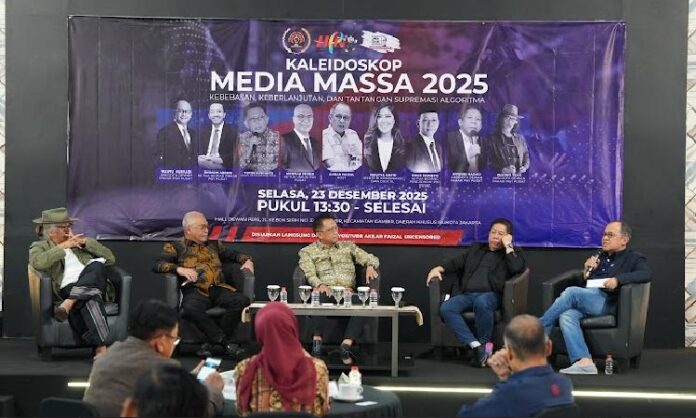 Jakarta (Waspada Aceh) – Persoalan kebebasan, keberlanjutan, dan tantangan supremasi algoritma terhadap media menjadi isu utama yang diperbincangkan oleh para pakar dan pelaku media dalam diskusi “Kaleidoskop Media Massa 2025”, di Aula Dewan Pers, Jl Kebon Sirih, Jakarta, Selasa (23/12/2025).