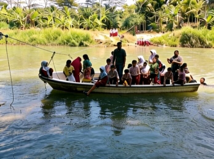 Tanpa jembatan, tanpa fasilitas yang memadai, harapan mereka bertumpu pada sebuah perahu fiber sederhana yang bergerak bergantung pada seutas tali tambang melintang di atas air. Setiap pagi, perahu kecil itu memuat beban berat: bukan hanya tubuh anak-anak, melainkan mimpi-mimpi besar yang ingin mereka gapai.