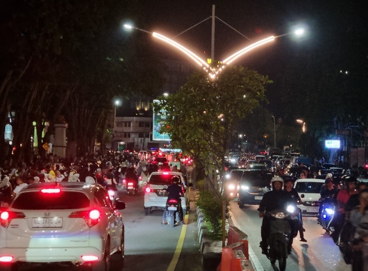 Tidak ada kembang api, petasan, maupun terompet yang biasanya menandai pergantian tahun di banyak kota lain di Indonesia. Meski demikian, aktivitas warga tetap terlihat di sejumlah ruas jalan utama.