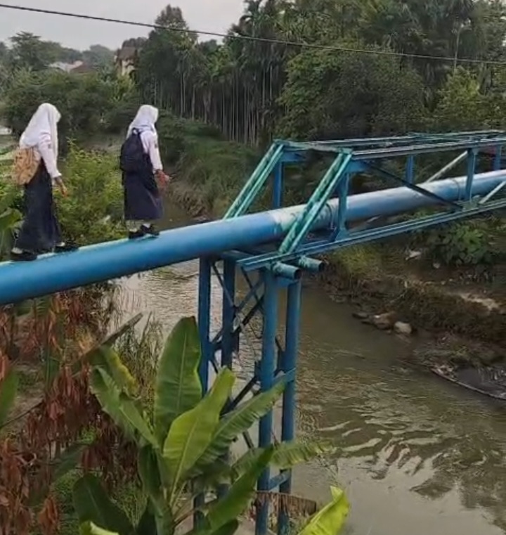 Kondisi mengerikan ini menjadi pemandangan rutin setiap pagi dan sore bagi para siswa SMPN 34 Kampung Baru. Bagi mereka, pipa besi itu adalah satu-satunya jalan penghubung agar bisa sampai ke sekolah tepat waktu.