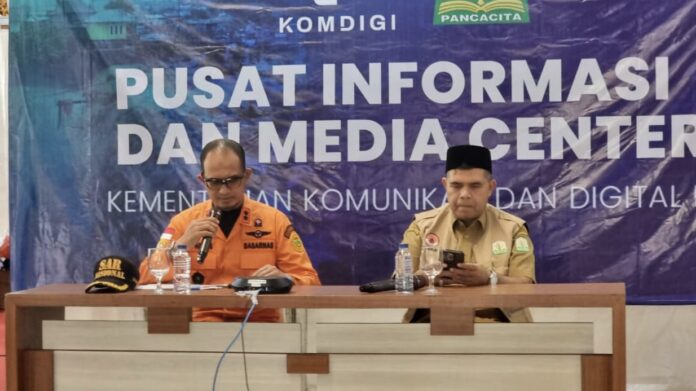 Ket Foto : Kepala Basarnas Banda Aceh, Ibnu Harris Al Hussain didampingi Juru Bicara Posko Tanggap Darurat Bencana Hidrometeorologi Aceh, Murthalamuddin, dalam konferensi pers yang digelar di Media Center Posko Tanggap Darurat, Senin (8/12/2025) siang. (*)