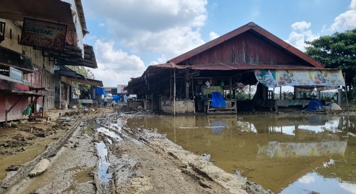 Pantauan di lokasi akses menuju di area pasar baru terbuka. Sejumlah kios masih dipenuhi lumpur tebal dan sisa material banjir, sehingga belum dapat difungsikan oleh pedagang.