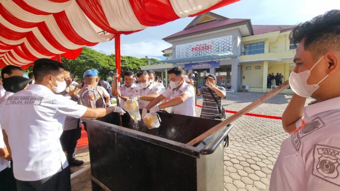 Banda Aceh (Waspada Aceh) – Kepolisian Daerah (Polda) Aceh memusnahkan barang bukti narkotika hasil pengungkapan selama tiga bulan terakhir. Total barang bukti yang dimusnahkan mencapai 80,5 kilogram sabu, 1,3 ton ganja, dan 1 kilogram kokain.