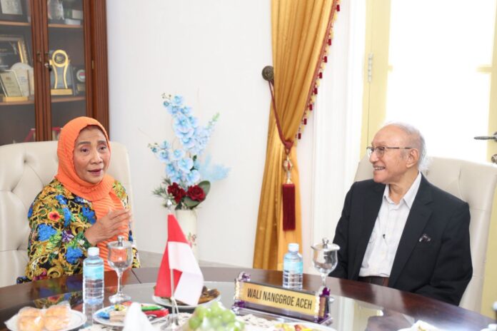Banda Aceh (Waspada Aceh) – Mantan Menteri Kelautan dan Perikanan Republik Indonesia, Susi Pudjiastuti, bersilaturahmi dengan Wali Nanggroe Aceh Tgk. Malik Mahmud Al Haythar, di Meuligoe Wali Nanggroe, Minggu (26/10/2025).
